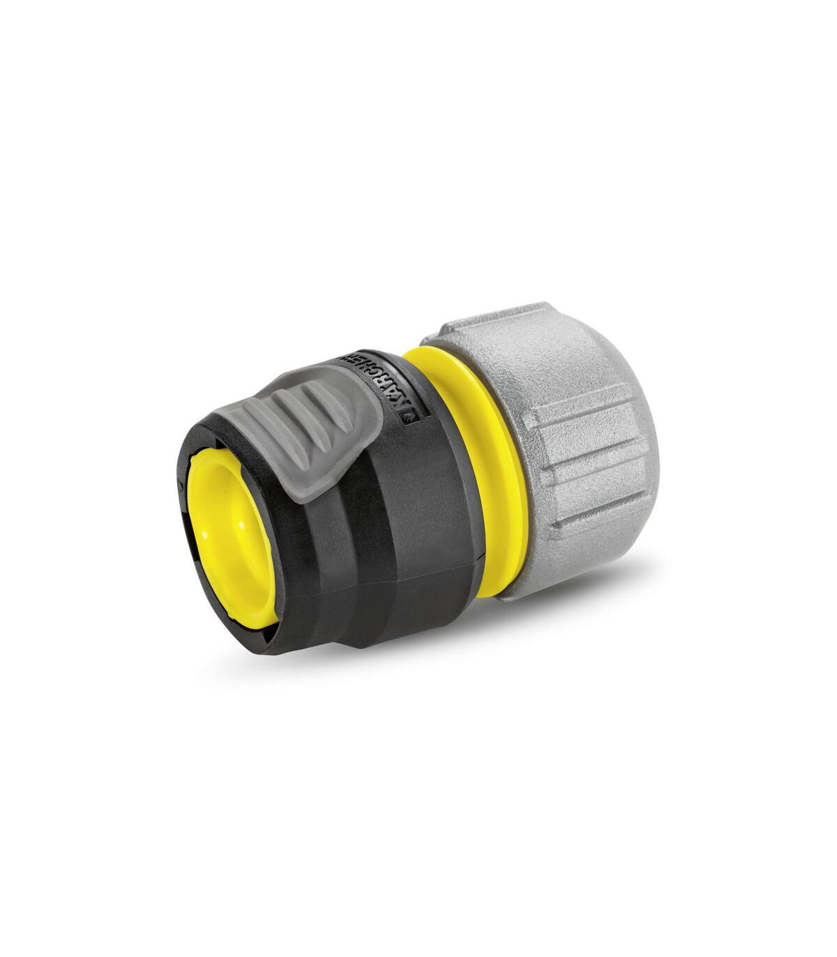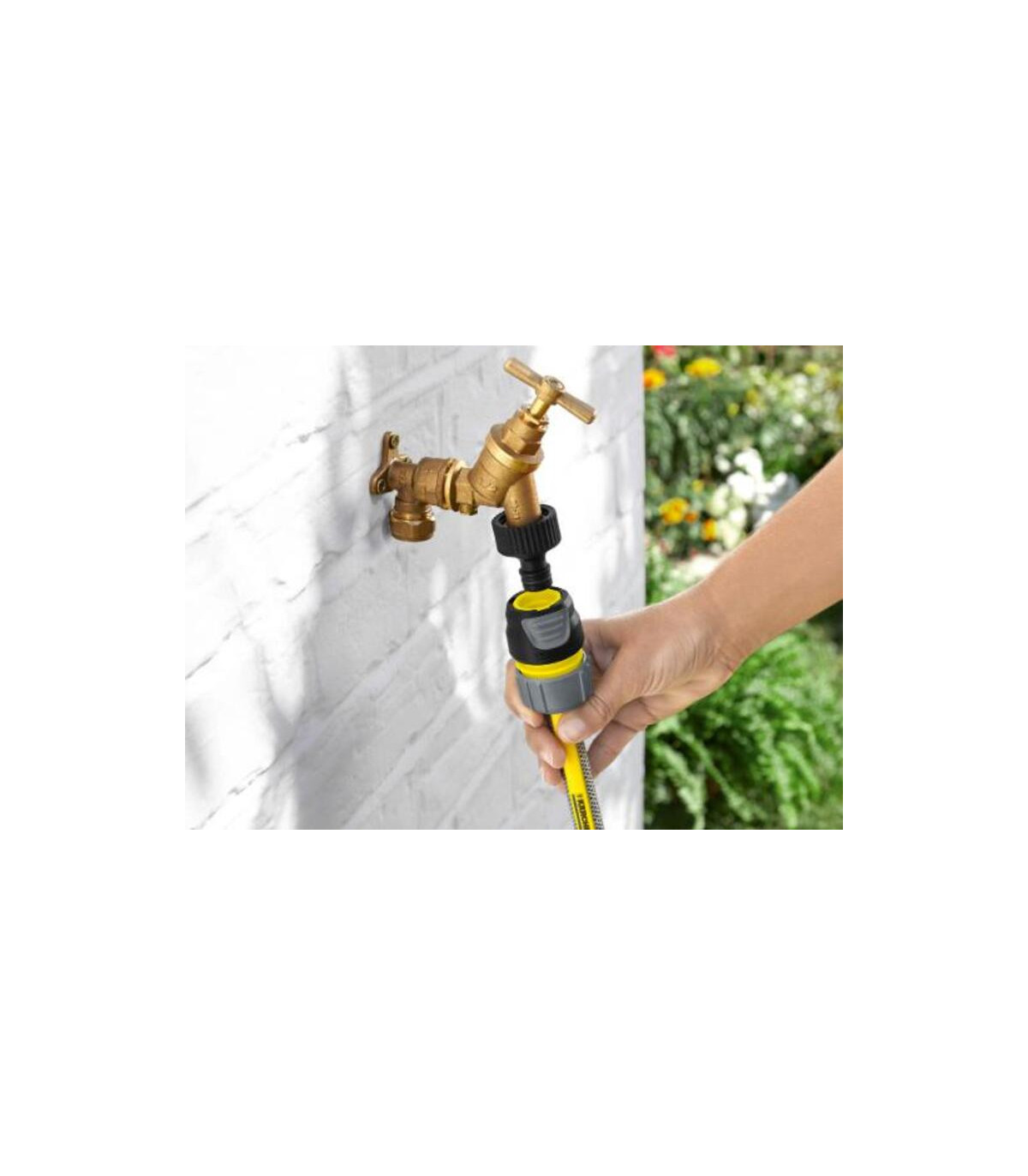Acoplar, desacoplar y reparar fácilmente: con el conector de mangueras universal Premium de alta calidad de Kärcher realizado en aluminio a prueba de corrosión y con superficies de agarre de plástico blando para un manejo especialmente cómodo. El sistema de conexión flexible simplifica de forma significativa el riego de jardines y superficies de tamaño pequeño y mediano. Pues unas conexiones de grifo y unos conectores de mangueras eficaces son la base de un buen sistema de riego. El conector de mangueras universal Premium es compatible con los tres diámetros de manguera más habituales y con todos los sistemas Click disponibles.