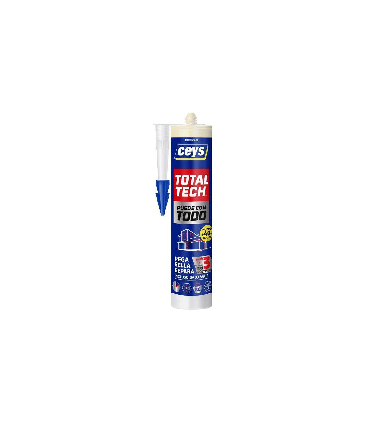 Sellador TOTALTECH BEIGE 290ml (cartucho), que pega, sella y repara bajo todo tipo de condiciones. Gran poder de relleno. Ultra elástico 370%. Resistencia a tracción 300Kg/10cm2. Sin disolventes. No ataca superficies delicadas. Pega todo tipo de materiales. Máxima adherencia con efecto Xpress forma piel en 7 minutos y seca en tan sólo 1h. Pintable en húmedo. 100% impermeable y hermético. Apto para el contacto con agua potable según UNE-EN 12873-1:2004. Alta resistencia al cloro en pegados en inmersión. Apto para el pegado de gresite en piscinas. Sellado de juntas de estanqueidad. Sellado de Juntas de dilatación. Sellado y pegado de tuberías de PVC. Sellado en Canalizaciones y bajantes. Pegado de placas Sandwich. Pegado y sellado de sanitarios. Pegado de placas aislantes. Pegado y sellado de mamparas. Pegado de espejos. Pegado de perfiles de aluminio. Sellado de cristales y ventanales Reparación temporal de grietas, fisuras y poros en Skimmer, limpia fondos, etc. Instalación de claraboy