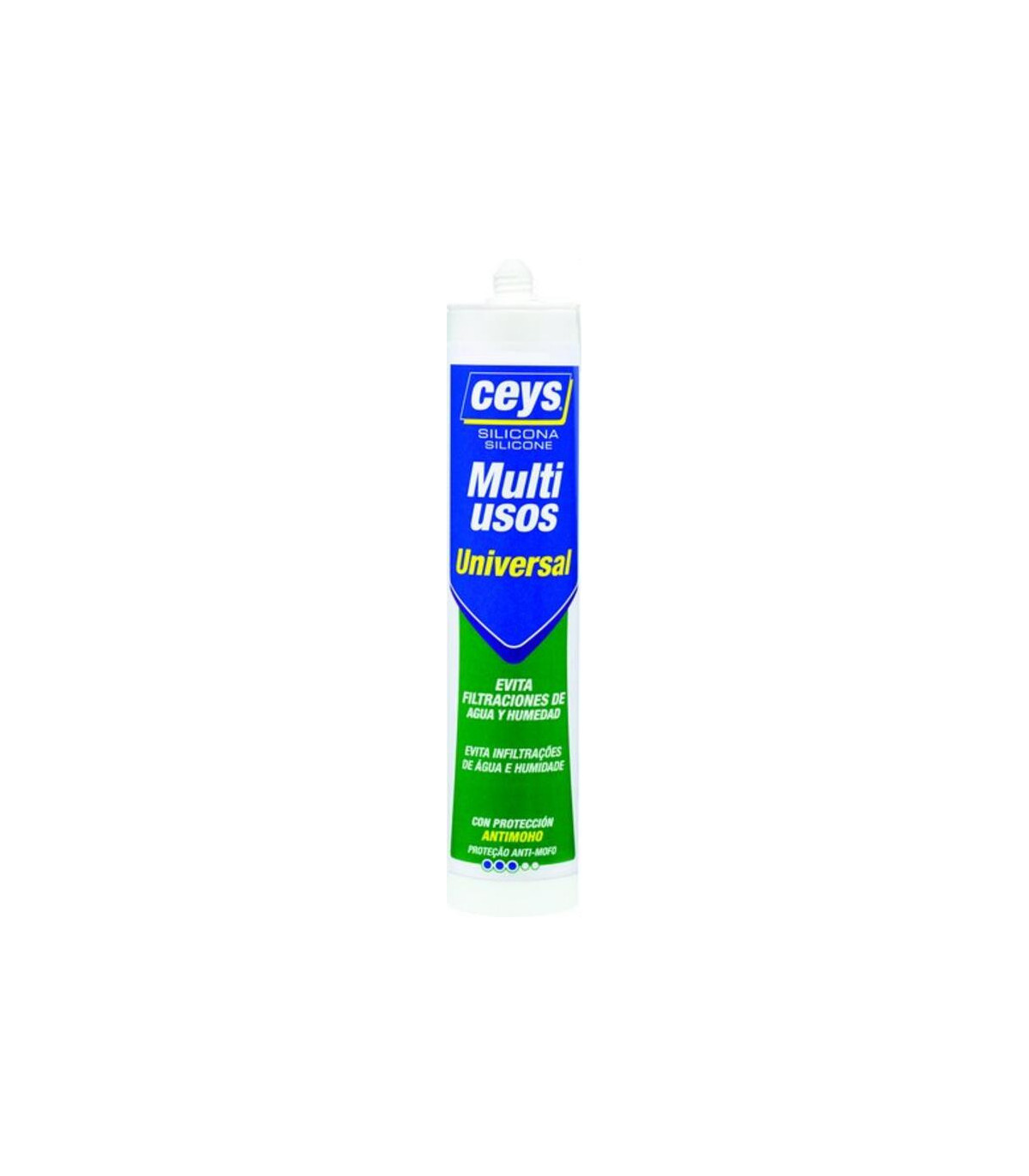 Silicona acida SELLACEYS UNIVERSAL blanco 280ml (cartucho), de uso general que sella, aísla, pega y rellena. Evita filtraciones de agua aire y humedad. Anti-moho básico Secado en 24 horasI100% impermeable. No pintable. Bañeras, lavabos. Cocinas, fregaderos. Acristalamiento, carpintería de aluminio. Sellado y relleno de todo tipo de juntas. Aplicaciones domésticas. La Silicona Ácida Sellaceys Universal de Ceys en color blanco y presentación de 280 ml (cartucho) es un sellador de alto rendimiento diseñado para todo tipo de aplicaciones domésticas y profesionales. Gracias a su formulación ácida, ofrece una adhesión excelente sobre superficies como vidrio, cerámica, aluminio, madera barnizada y la mayoría de materiales no porosos, garantizando un sellado duradero y resistente al agua, humedad y cambios de temperatura. Es ideal para sellar juntas en baños, cocinas, ventanas y otros espacios que requieran protección frente a filtraciones y humedad.Su presentación en cartucho de 280 ml facili