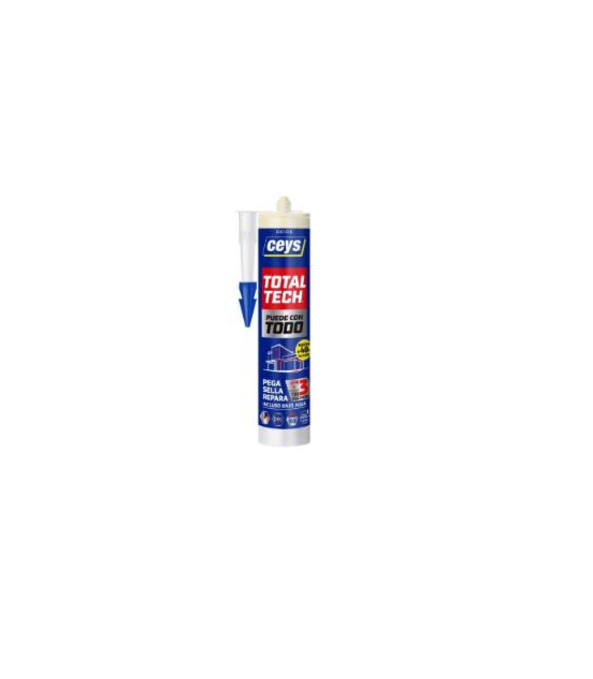 Sellador TOTALTECH BEIGE 290ml (cartucho), que pega, sella y repara bajo todo tipo de condiciones. Gran poder de relleno. Ultra elástico 370%. Resistencia a tracción 300Kg/10cm2. Sin disolventes. No ataca superficies delicadas. Pega todo tipo de materiales. Máxima adherencia con efecto Xpress forma piel en 7 minutos y seca en tan sólo 1h. Pintable en húmedo. 100% impermeable y hermético. Apto para el contacto con agua potable según UNE-EN 12873-1:2004. Alta resistencia al cloro en pegados en inmersión. Apto para el pegado de gresite en piscinas. Sellado de juntas de estanqueidad. Sellado de Juntas de dilatación. Sellado y pegado de tuberías de PVC. Sellado en Canalizaciones y bajantes. Pegado de placas Sandwich. Pegado y sellado de sanitarios. Pegado de placas aislantes. Pegado y sellado de mamparas. Pegado de espejos. Pegado de perfiles de aluminio. Sellado de cristales y ventanales Reparación temporal de grietas, fisuras y poros en Skimmer, limpia fondos, etc. Instalación de claraboy
