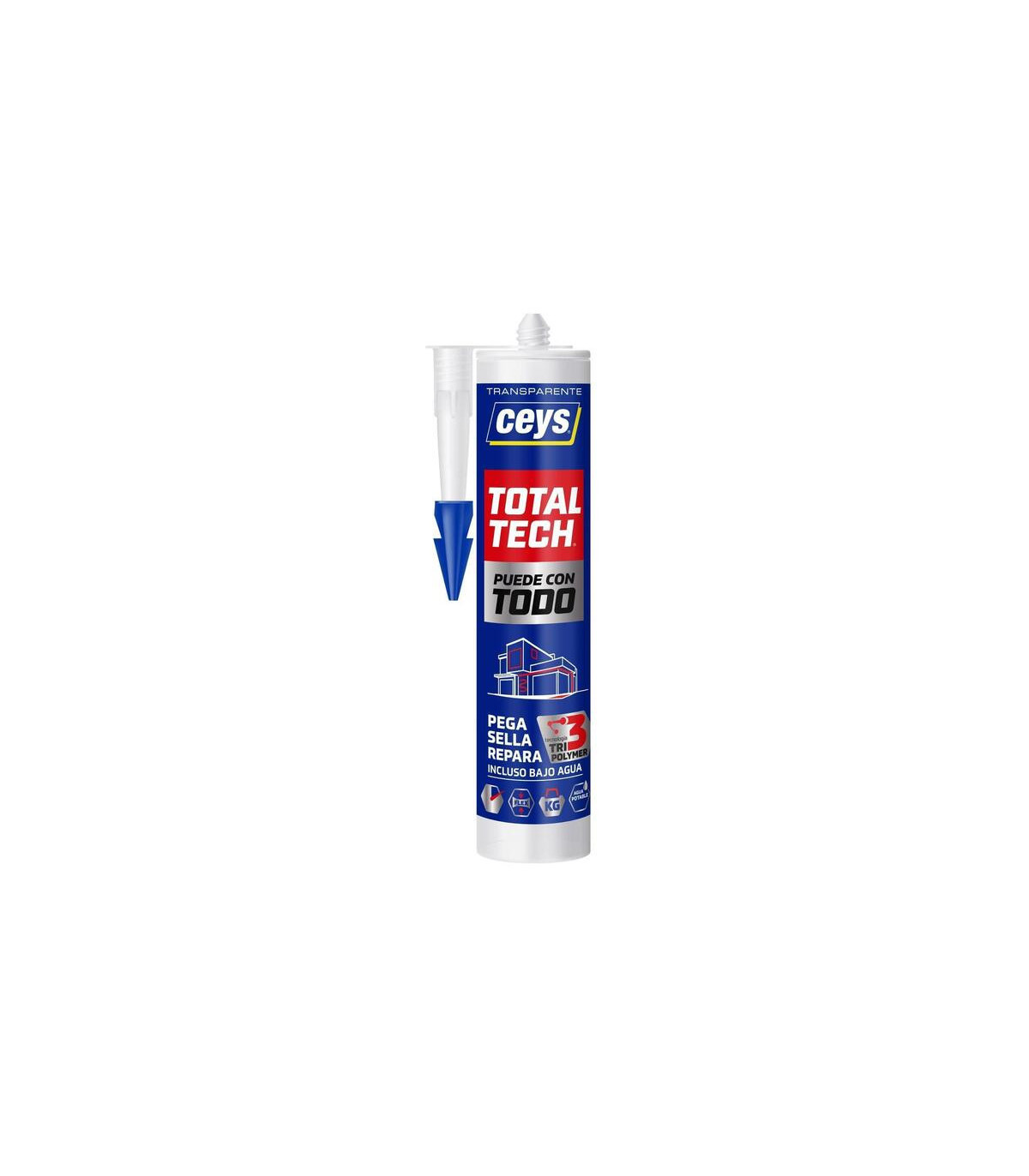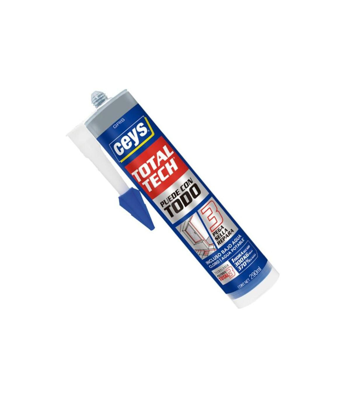 Sellador TOTALTECH transparente 290ml (cartucho), que pega, sella y repara bajo todo tipo de condiciones. Gran poder de relleno. Ultra elástico 370%. Resistencia a tracción 300Kg/10cm2. Sin disolventes. No ataca superficies delicadas. Pega todo tipo de materiales. Máxima adherencia con efecto Xpress forma piel en 7 minutos y seca en tan sólo 1h. Pintable en húmedo. 100% impermeable y hermético. Apto para el contacto con agua potable según UNE-EN 12873-1:2004. Alta resistencia al cloro en pegados en inmersión. Apto para el pegado de gresite en piscinas. Sellado de juntas de estanqueidad. Sellado de Juntas de dilatación. Sellado y pegado de tuberías de PVC. Sellado en Canalizaciones y bajantes. Pegado de placas Sandwich. Pegado y sellado de sanitarios. Pegado de placas aislantes. Pegado y sellado de mamparas. Pegado de espejos. Pegado de perfiles de aluminio. Sellado de cristales y ventanales Reparación temporal de grietas, fisuras y poros en Skimmer, limpia fondos, etc. Instalación de c