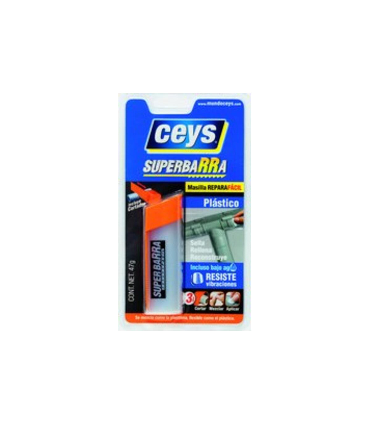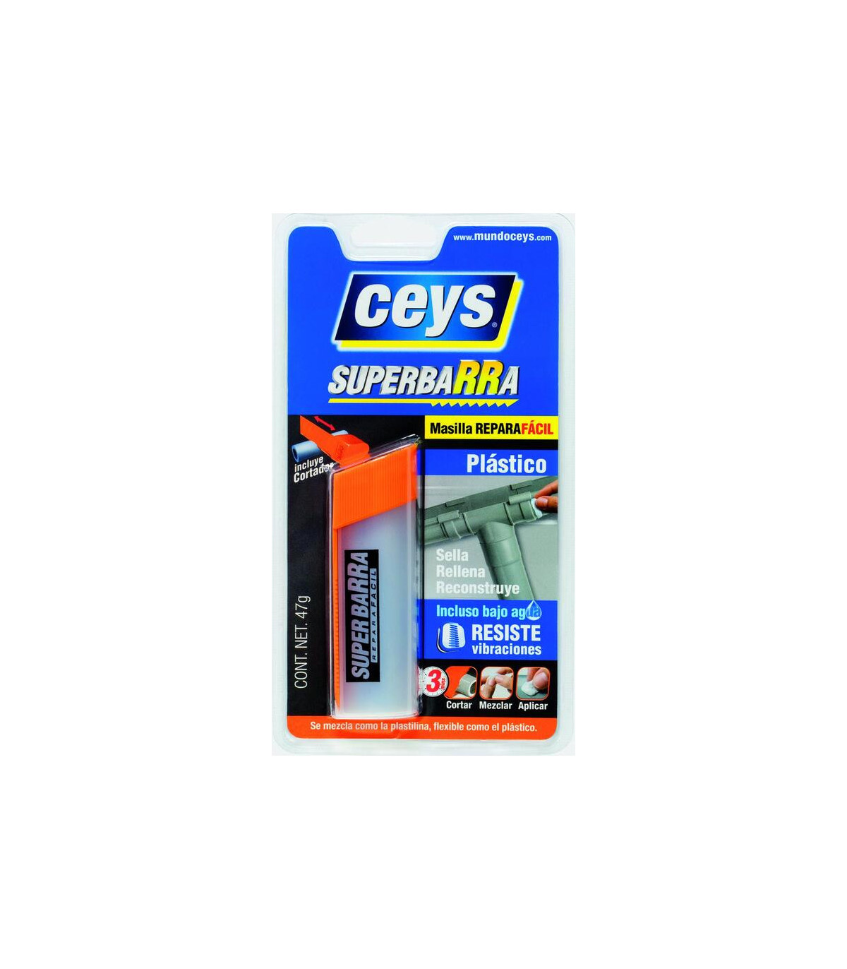 Reparador plástico CEYS SUPERBARRA (blíster), que sella, rellena y reconstruye todo tipo de plástico. Fácilmente moldeable, se mezcla como la plastilina y una vez aplicado adquiere la misma adaptabilidad que el plástico y crea súper cíes fuertes y resistentes. Acabados de alta calidad: se puede lijar, taladrar, pulir, pintar y barnizar. Alta adherencia en plásticos: PVC, metacrilato, ABS. Alta consistencia: Una vez mezclado no se rompe ni deforma, permitiendo dar la forma deseada. Actúa en condiciones adversas, humedad y temperatura, endurece bajo agua. Sella: pequeños escapes en tuberías de PVC. Reconstruye: todo tipo de objetos, Maquetas, E10Modelos de plástico. Repara: desperfectos en general, Piezas de interior de coche, Parachoques. Fija: objetos en pared, Palo con escoba, Refuerza uniones debilitadas El reparador plástico Ceys Superbarra (referencia 505031) es un adhesivo termofusible en formato barra, presentado en blíster, diseñado para reparaciones rápidas y duraderas en mater