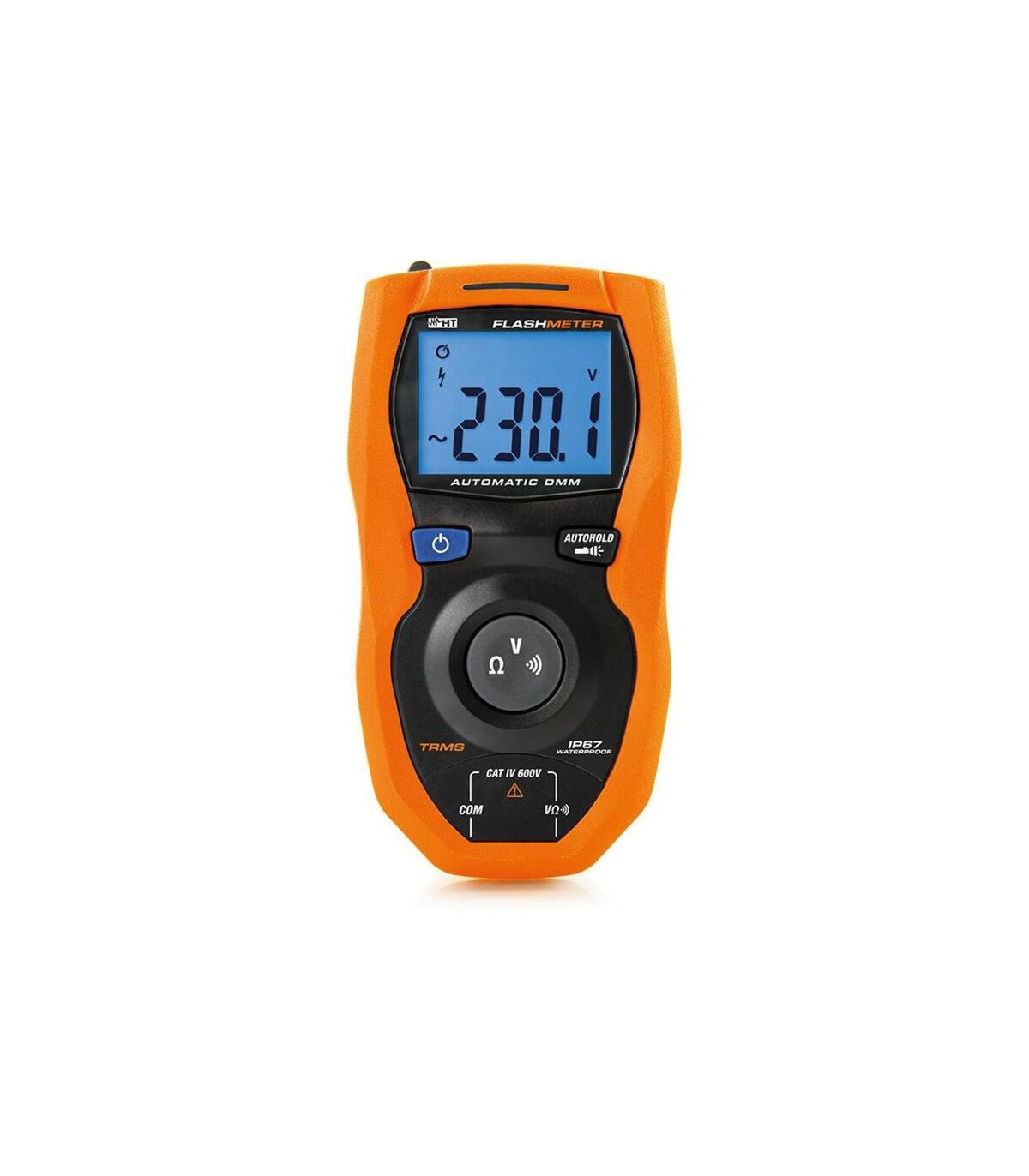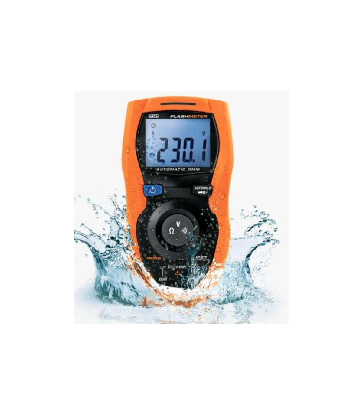 Multímetro inteligente digital capaz de realizar de una manera totalmente automática las mediciones de voltaje en autorango tanto en corriente alterna como continua. Dispone además de una linterna de luz blanca led, un sensor para detectar la tensión de corriente alterna sin contacto y un grado de protección contra las salpicaduras de agua El 0667 Flashmeter de HT-Instruments és un multímetre intel·ligent TRMS dissenyat per a professionals que necessiten mesures precises i fiables en qualsevol entorn. Amb classificació CAT IV, ofereix protecció avançada en instal·lacions d’alta tensió, garantint seguretat total durant l’ús. La seva protecció IP67 el fa resistent a pols i a immersió temporal en aigua, sent ideal per a condicions de treball exigents i entorns industrials.Aquest multímetre incorpora funcions avançades de mesura TRMS, permetent registrar tensions i corrents amb gran precisió, incloent mesures de continuïtat, resistència, capacitat i freqüència. La seva interfície intel·lig