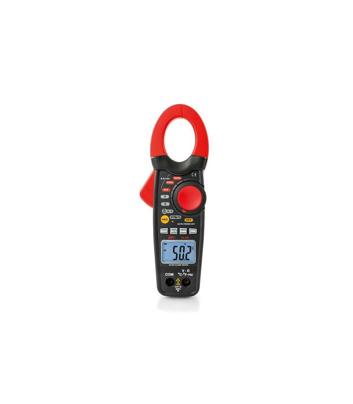 Pinza amperimétrica diseñada para la medida de corriente alterna de hasta 1000A, y tensión de hasta 600V. La pinza está dotada de un amplio visualizador retro iluminado a 4000 puntos de medida con retroiluminación y barra gráfica para realizar simples lecturas también en ambientes escasamente iluminados. La pinza amperimétrica digital G36 de HT-Instruments és una eina professional i versàtil dissenyada per a la mesura precisa de corrent altern i corrent continu fins a 1000A, així com per registrar temperatures, la qual cosa la converteix en un instrument integral per electricistes i tècnics de manteniment.Equipada amb un display digital de gran precisió, la G36 permet lectures ràpides i fiables, minimitzant errors de lectura i millorant l’eficiència en treballs d’instal·lació i diagnòstic elèctric. La seva pinça oberta de gran capacitat facilita la mesura sense necessitat de desconnectar els conductors, aportant comoditat i seguretat en entorns professionals.La construcció robusta amb