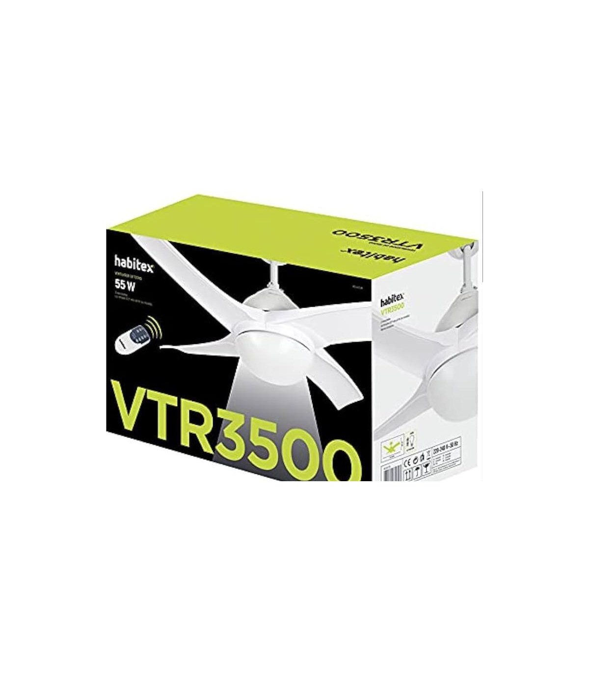 El ventilador de techo HABITEX VTR-3500 tiene una potencia de 55 W con 3 velocidades. Está equipado por un motor AC. Tiene 4 hélices que hacen un diámetro total 91,5 cm. Lo podrás instalar de una manera muy fácil en cualquier estancia. Con el mando a distancia que incorpora, te será más fácil manejarlo desde cualquier punto de la estancia. Una de las ventajas de los ventiladores de techo es que hacen de elemento decorativo en tu hogar y a la vez son saludables, ya que no provocan sequedad de garganta ni de ojos, ni resfriados debido a corrientes de aire excesivamente frías. Luz lámpara E27 máx 60W (no incluida). Viene presentado en caja y tiene 3 años de garantía. El mando a distancia funciona con 3 pilas AAA no incluidas.