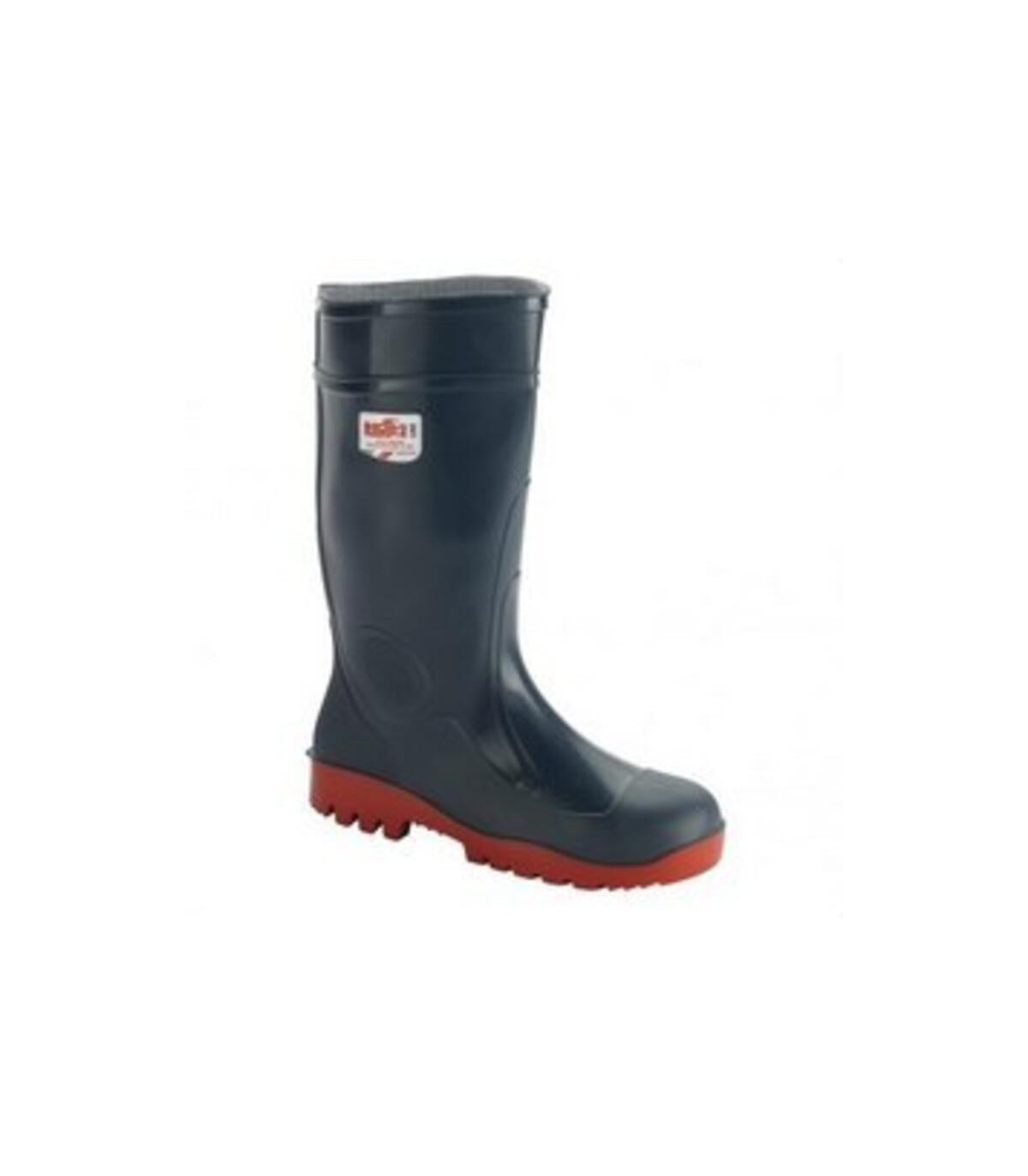 Bota de seguridad fabricada en PVC de la talla 46 con acabado en color verde, con puntera y láminas metálicas, suela de carro armado, corte ergonómico y tres tipos de acabados para una fácil limpieza. Inserto en el talón para facilitar su cambio.
