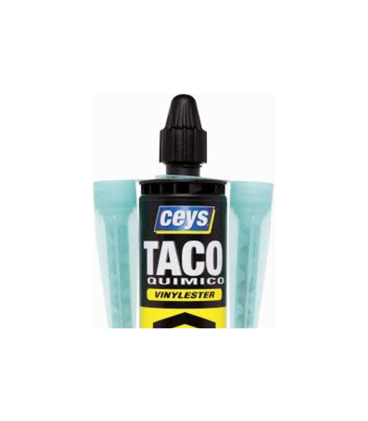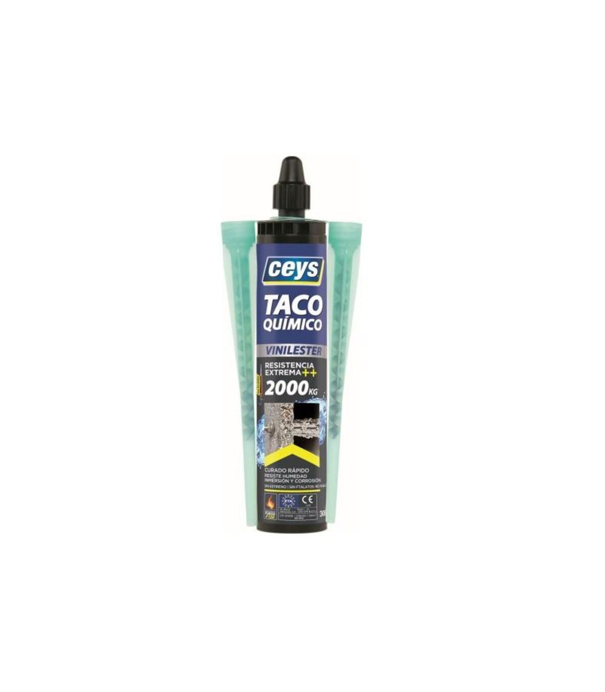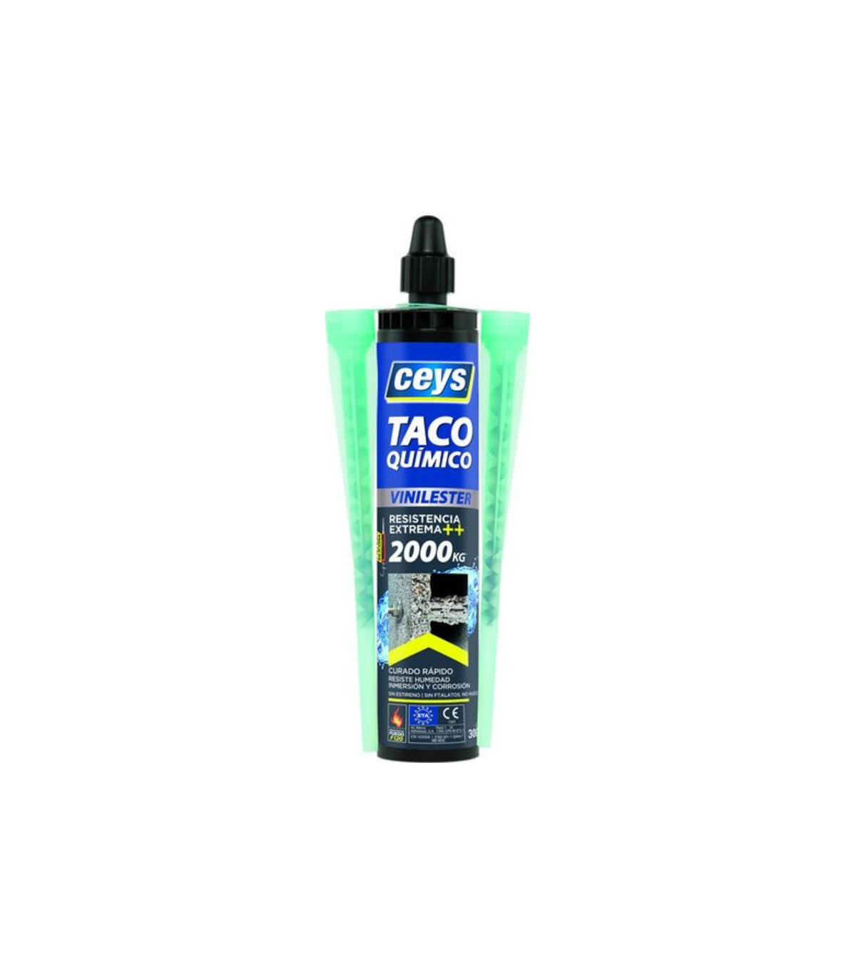 Taco químico vinylester CEYS gris 300ml (cartucho), que asegura un anclaje extremadamente resistente sobre soportes huecos, frágiles o compactos tipo ladrillo, hormigón, cemento, piedra natural, madera. Resistencia de carga: 900kg (fijación M12 soporte hormigón mayor o igual que B25. Anclaje 5,8 zinc galvanizado / A4-70). Resistencia a tracción: 560 kg/cm2. Resistencia a compresión: 1080 kg/cm2. Rendimiento: 49 anclajes M10 por cartucho. Resistencia térmica hasta +80ºC con puntas de hasta +110ºC. Temperatura óptima de aplicación: 20ºC. Tiempos de secado en función de la temperatura. Indicado para la fijación y anclaje de tornillos, pernos, espárragos, varillas roscadas en encofrados, estructuras metálicas, etc. El taco químico Vinylester CEYS gris de 300 ml, referencia 901620, es un adhesivo bicomponente en base de resina de vinylester, libre de estireno y ftalatos, diseñado para anclajes de alta resistencia en soportes huecos, compactos o frágiles como ladrillo, hormigón, piedra natur