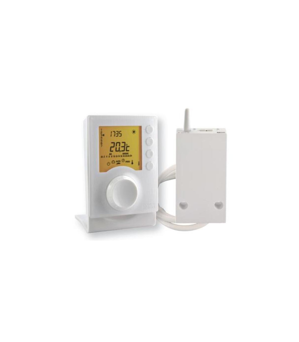 Producto sin stock temporalmente. Nos pondremos en contacto para confirmar fecha de entrega Termostato programable TYBOX 137 de Delta Dore, diseñado para control inalámbrico de sistemas de calefacción. Este dispositivo permite ajustar la temperatura de manera precisa y eficiente, optimizando el consumo energético y proporcionando confort personalizado en cada estancia.Cuenta con funciones programables diarias y semanales, facilitando la adaptación a h