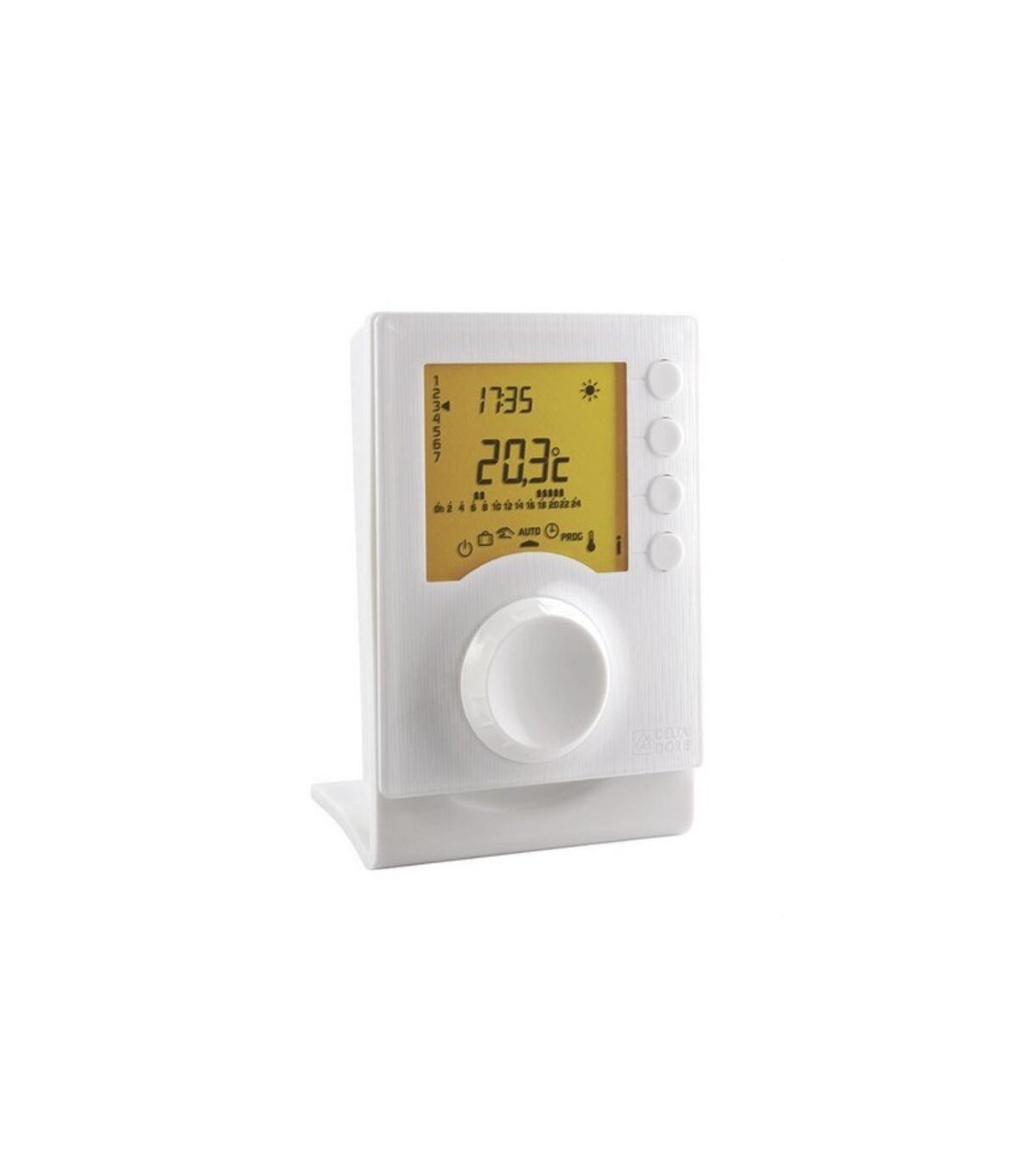 Termostato programable con 2 niveles de consigna. Regulación electrónica eficiente para un ahorro significativo. Simplicidad de uso gracias a su selector central. Regulación para caldera o bomba de calor no reversible. Programación semanal. Ajuste de 2 consignas de temperatura. Elección de programación de ¼ de hora, ½ hora o una hora. Ausencia programable de 1 a 365 días con ayuda del calendario integrado. Visualización horaria de la duración del funcionamiento de la caldera (sin ACS). Cambio de hora automático: verano/invierno.